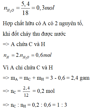 Phân tử hợp chất hữu cơ A có 2 nguyên tố. Đốt cháy hoàn toàn 3 gam chất A thu được 5,4 gam nước. Biết khối lượng mol của A là 30 gam. Công thức phân tử của A là