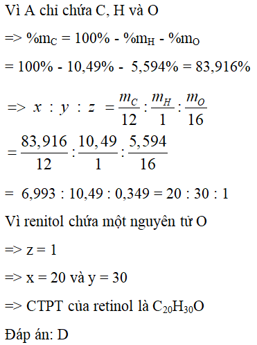 Vitamin A là một chất dinh dưỡng thiết yếu cho con người. Trong thực phẩm, vitamin A tồn tại ở dạng chính là retinol (chứa C, H, O) trong đó thành phần % khối lượng H và O tương ứng là 10,49% và 5,594%. Biết CTPT của retinol là: