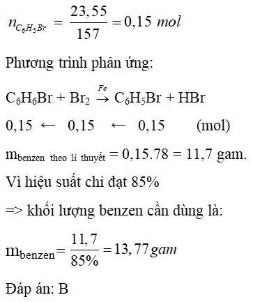 Tính khối lượng benzen cần dùng để điều chế 23,55 gam brombenzen. Biết hiệu suất phản ứng đạt 85%.