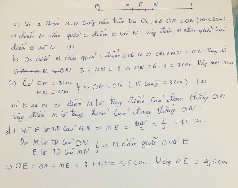 a, Trên tia Ox có OM<ON ( vì 3cm < 6cm ) nên điểm M nằm giữa hai điểm O và N.