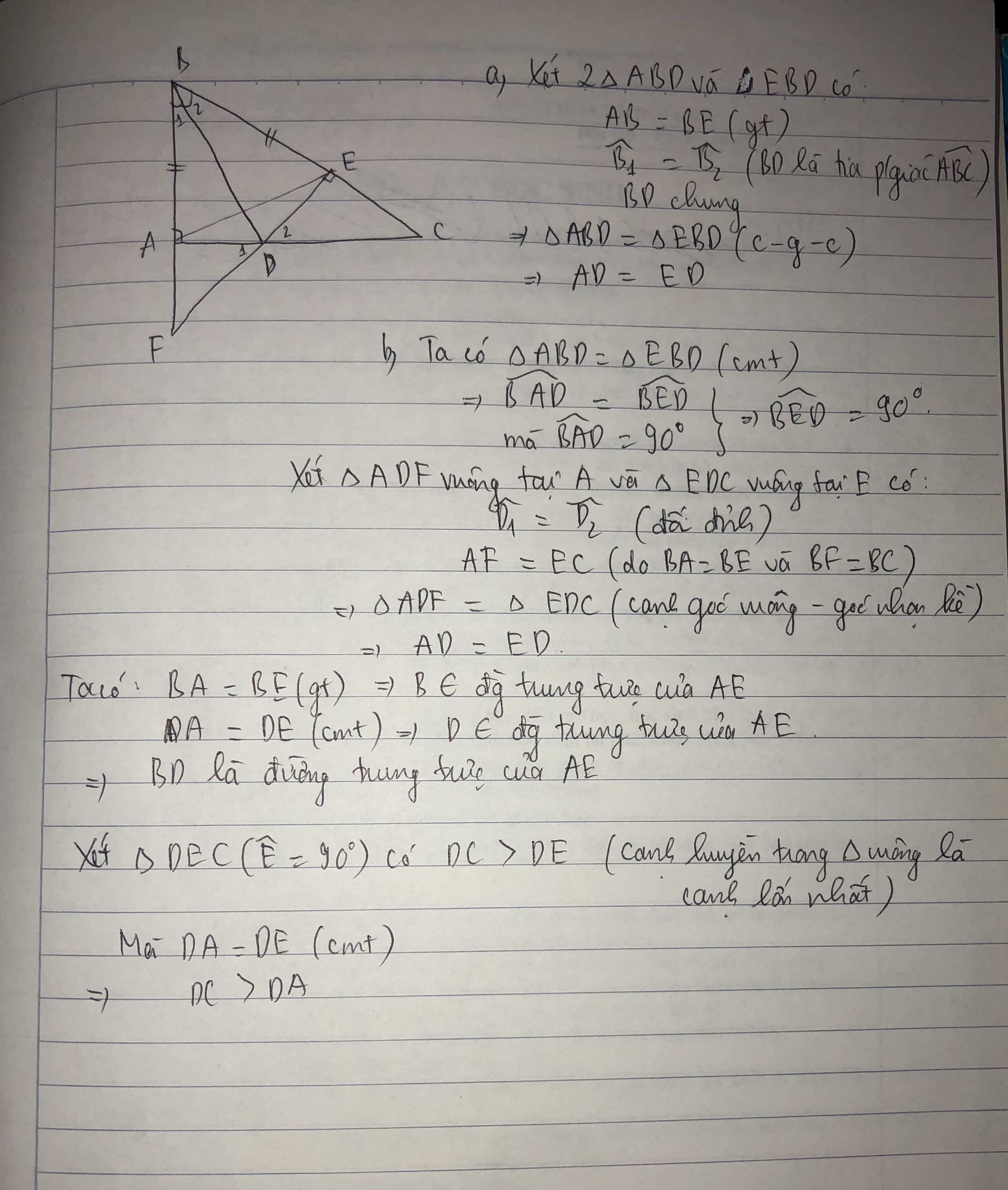 cho tam giác ABC vuông tại A. Trên cạnh BC lấy điểm E sao cho BE= BA, trên tia BA lầy điểm F sao cho BF=BC. Kẻ BD là tia phân giác của góc ABC (D thuộc AC). CM