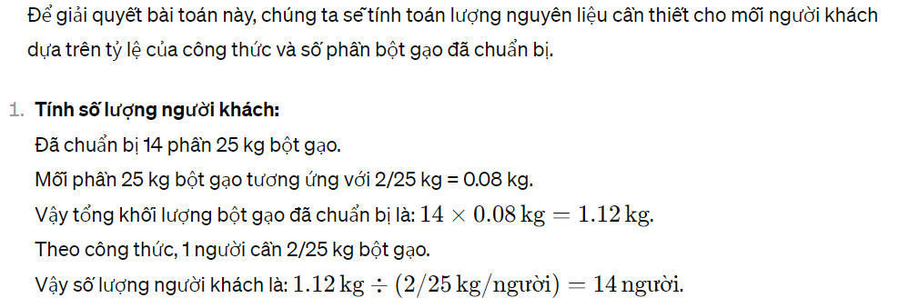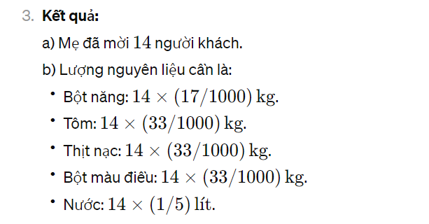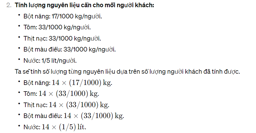 Mẹ có công thức làm bánh nặn thuế cho một người, với mỗi loại nguyên liệu như sau: kg bột gạo, kg bột năng, kg tôm, kg thịt nạc, l nước, kg bột màu điều. Hôm nay, mẹ chuẩn bị vừa đủ 14 phần 25 kg bột gạo làm món bánh nậm Huế mới khách đến chơi nhà. Hỏi: