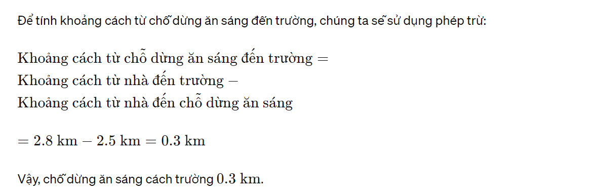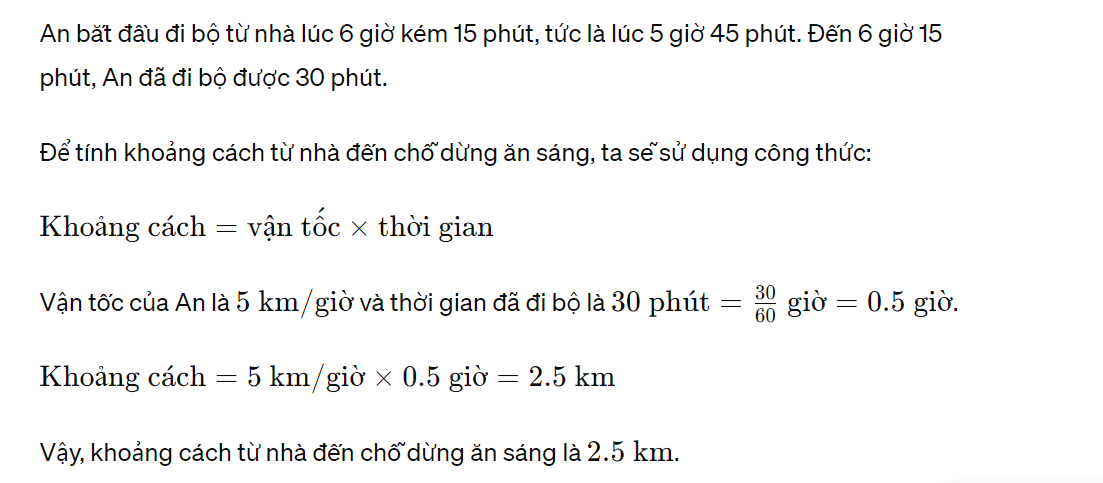 5 km/giờ. Đến 6 giờ 15 phút, An dừng ăn sáng. Hỏi chỗ dừng ăn sáng cách trường bao xa, biết nhà An cách trường 2,8km
