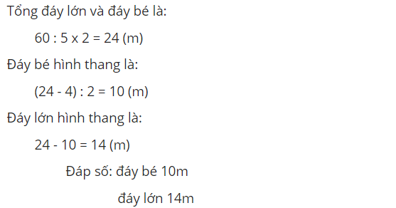 Một hình thang có diện tích 60m2, hiệu của hai đáy bằng 4m.hãy tính độ dài mỗi dáy biết chiều Cao của hình thang là 5m