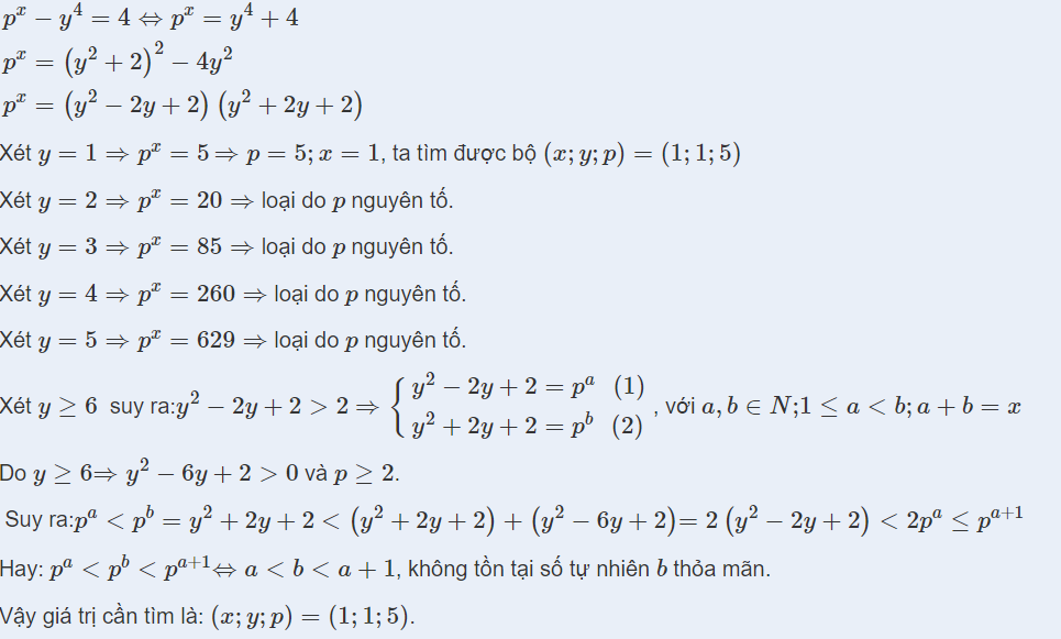 Ta cùng giải phương trình p^x = y^4 + 4 để tìm các số tự nhiên x, y, và số nguyên tố p.