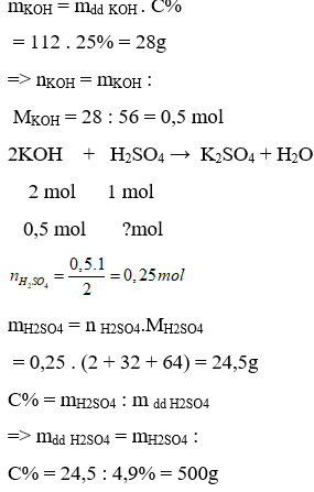 Để trung hòa 112 gam dung dịch KOH 25% thì cần dùng bao nhiêu gam dung dịch axit sunfuric 4,9%: