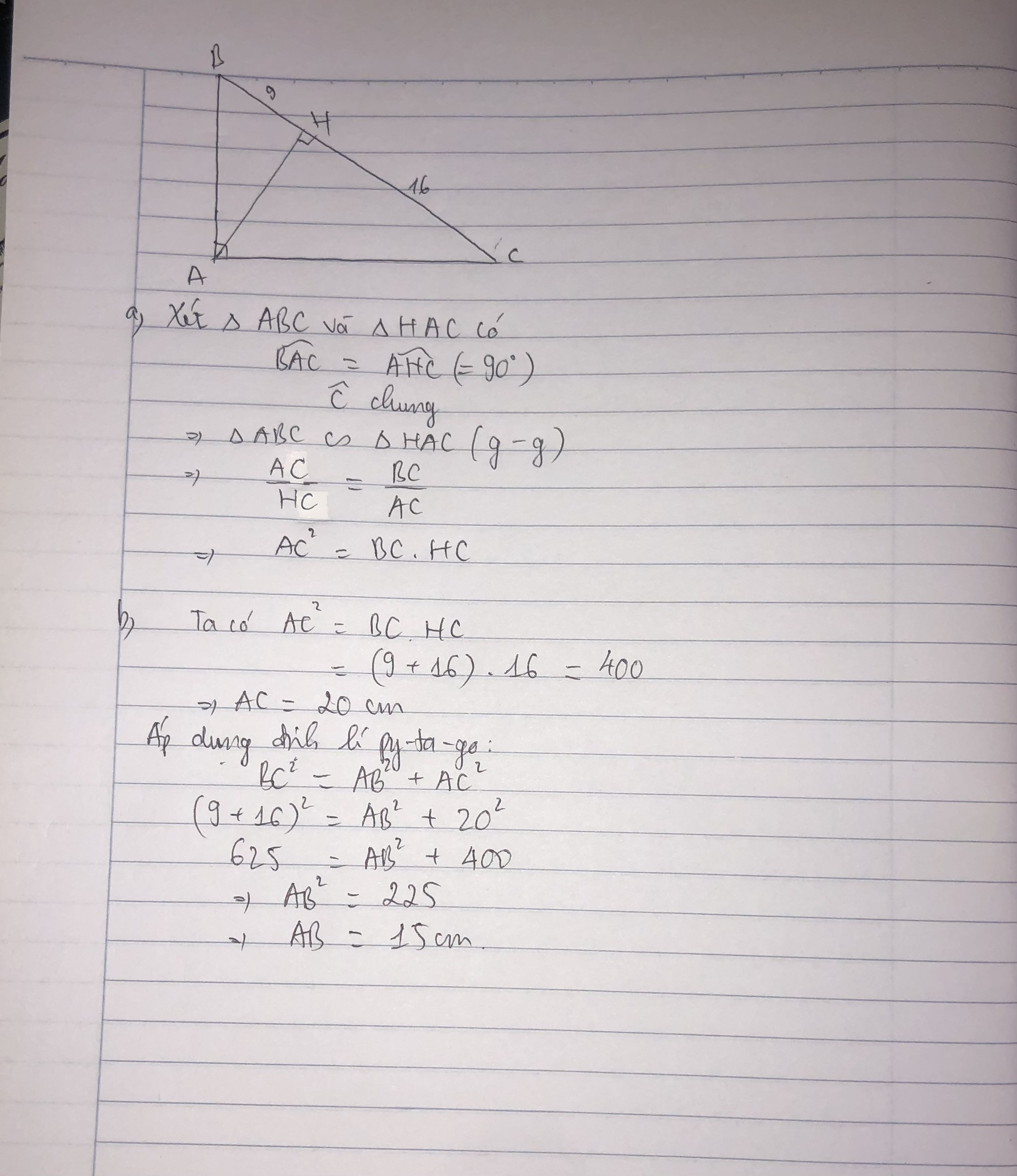 b. Cho biết HB = 9cm, HC = 16cm. Tính độ dài các cạnh AB,AC của tam giác ABC.