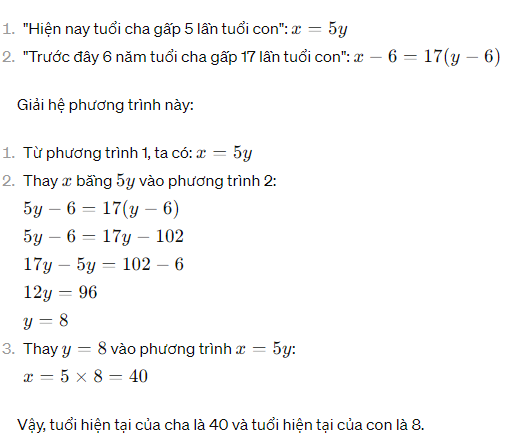 Trước đây 6 năm, tuổi cha gấp 17 lần tuổi con: y−6=17(x−6)y - 6 = 17(x - 6)