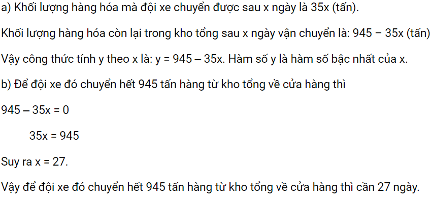 Khối lượng hàng hóa còn lại trong kho tổng sau x ngày vận chuyển là: 945 – 35x (tấn).