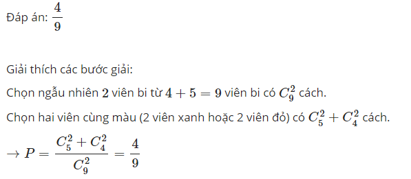 Vậy xác suất chọn được 2 viên bi cùng màu là: 16/36 = 4/9.