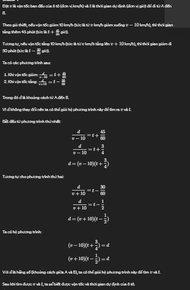 Một ô tô đi từ A đến B với một vận tốc xác định và thời gian đã định.Nếu vận tốc ô tô giảm 10km/h thì thời gian tăng 45 phút.Nếu vận tốc ô tô tăng 10km/h thì thời gian giảm 30 phút.Tính vận tóic và thời gian dự định của ô tô