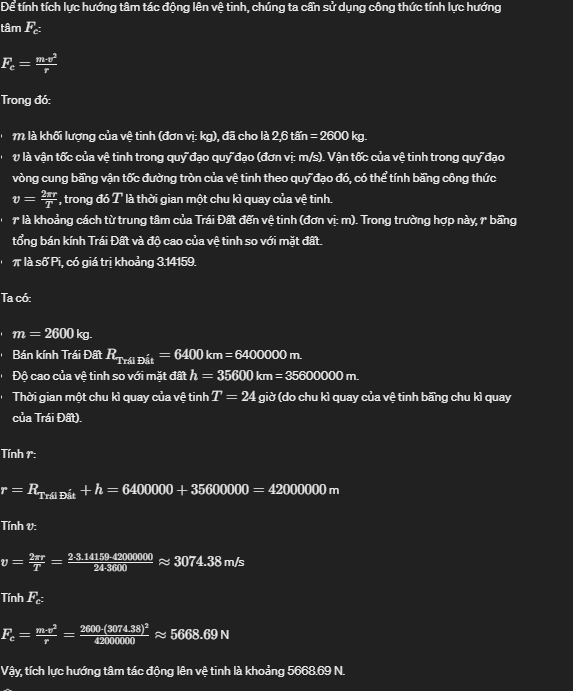 Một vệ tinh nhân tạo có khối lượng 2,6 tấn đang hoạt động ở độ cao 35600km so với mặt đất ,chuyển động theo chiều quay của trái đất và có chu kì quay bằng đúng chu kì quay của trái đất . Biết bán kính trái đất là 6400km. Tích lực hướng tâm tác dụng lên vệ tinh.