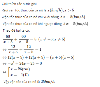 B về A hết tổng thời gian 5 giờ. Biết quãng đường sông từ A đến B dài 60 km và vận tốc dòng nước là 5km/h. Tính vận tốc thực của ca nô.