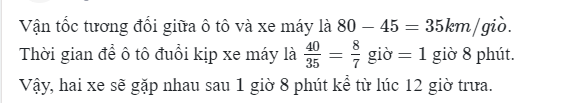 Vận tốc tương đối giữa ô tô và xe máy là $80 - 45 = 35 km/gi\grave {o}$.