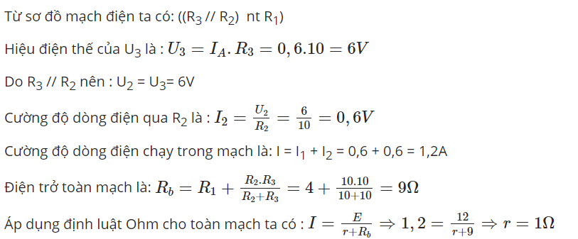 Bài 4. Cho mạch điện có sơ đồ như hình bên: E = 12V r = 1Omega R1 = 4Omega R2= R3= 10Omega Bỏ qua điện trở của ampe kế A và dây nối. Số chỉ của ampe kế là 0,6 A. Xác định năng lượng và công suất điện ở mạch ngoài trong thời gian 30 phút.