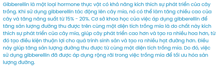 2. **Tăng năng suất:** Gibberellins cũng có thể ảnh hưởng đến quá trình sản xuất và chuyển hóa chất dinh dưỡng trong cây, từ đó tăng cường sinh trưởng và phát triển của các cành mía và búp mía. Điều này dẫn đến việc tăng năng suất của cây mía, giúp sản lượng đường thu được từ mỗi cây mía tăng lên.