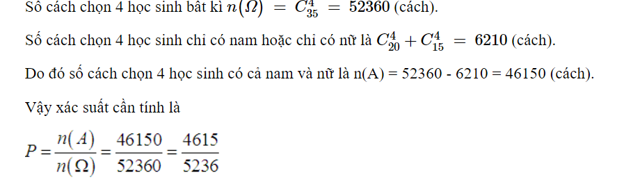 Để tính xác suất để 4 học sinh được chọn lên bảng có cả nam và nữ, chúng ta sẽ tính tổng số trường hợp thỏa mãn và chia cho tổng số trường hợp có thể xảy ra.