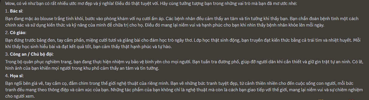 Trong những giấc mơ ấy, em không chỉ nhìn thấy hình ảnh của mình trong tương lai, mà còn thấy được những giá trị cao cả và ý nghĩa của từng nghề nghiệp. Dù là bác sĩ, cô giáo, công an, bộ đội hay họa sĩ, em đều mong muốn được cống hiến và mang lại những điều tốt đẹp cho cuộc sống. Những giấc mơ ấy vẫn luôn là ngọn đèn soi sáng, dẫn lối em trên con đường trưởng thành và phát triển.
