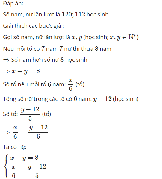 Nhóm 1 học sinh tham gia hoạt động ngoại khoá được chia thành các tổ để sinh hoạt Nếu mỗi tổ có 7 nam và 7 nữ thì thửa 8 bạn nam. Nếu mỗi tổ có 6 nam và 5 nữ thi thừa 12 nữ. Hỏi có bao nhiêu học sinh nam và bao nhiều học sinh nữ