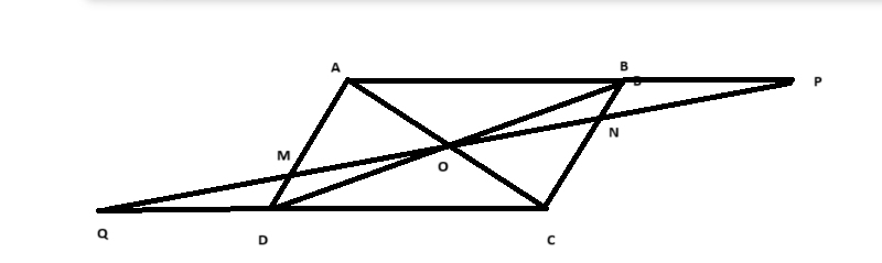 Để chứng minh \( ON \cdot OP = OM \cdot OQ \), ta xét hình bình hành \( ABCD \) với \( O \) là giao điểm của đường chéo \( AC \) và \( BD \).