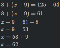 \[ 8 + (x - 3)^2 = 125 - 64 - 4 \]