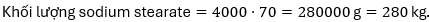 \text{Tổng khối lượng sodium stearate} = 4000 \, \text{bánh} \times 70 \, \text{gam} = 280000 \, \text{gam} = 280 \, \text{kg}