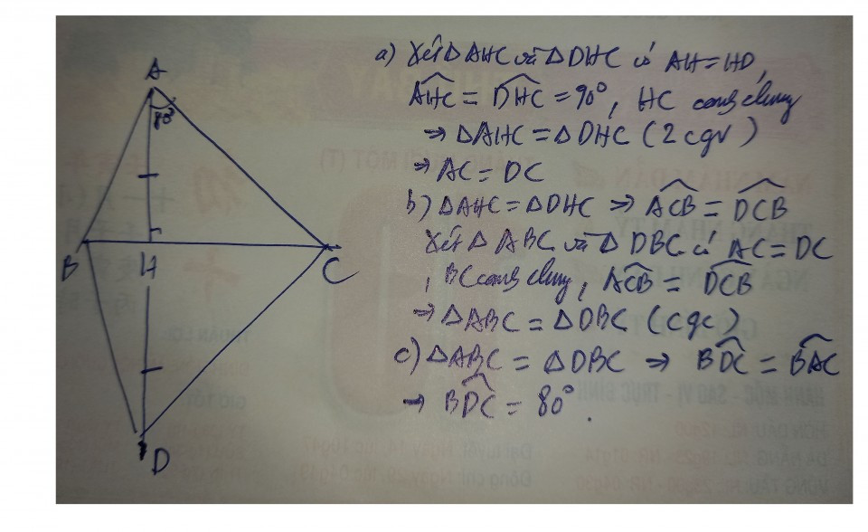 Bài 4: Cho tam giác ABC có góc 4=80° .Dựng AH vuông góc với BC (H = BC ). Trên tia đối tia HA lấy điểm D sao cho HD = HA. a) Chứng minh: AC = DC . b) Chứng minh: A4BC = ADBC. c) Xác định số đo góc BDC.