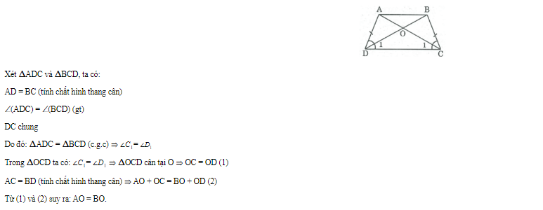 Vậy ta có thể khẳng định rằng \( OA = OB \) và \( OC = OD \). Do đó, hai đoạn thẳng từ giao điểm của hai đường chéo đến các đỉnh của hình thang cân đều bằng nhau, chứng minh đúng yêu cầu đề bài.