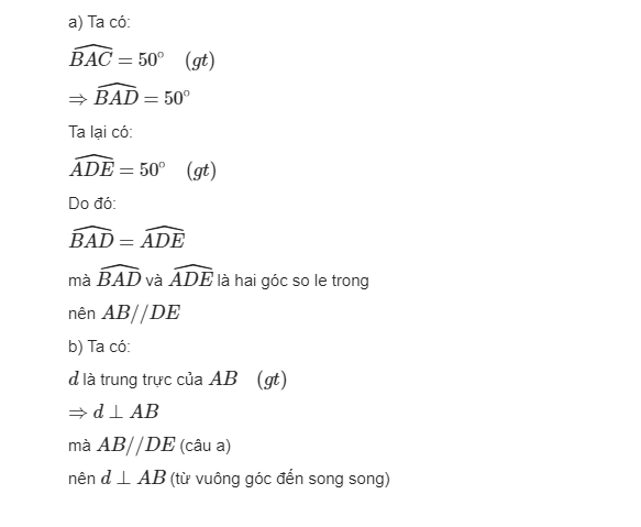 cho tam giác ABC có góc A = 50 độ ; lấy điểm D thuộc đg thg AC ; vẽ tia DE về phía ko chứa điểm B sao cho ADE = 50 độ / a. CMR AB // DE ; b.kẻ đg thg d là đg trung trực của AB . CTR d vuông góc với DE