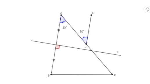 cho tam giác ABC có góc A = 50 độ ; lấy điểm D thuộc đg thg AC ; vẽ tia DE về phía ko chứa điểm B sao cho ADE = 50 độ / a. CMR AB // DE ; b.kẻ đg thg d là đg trung trực của AB . CTR d vuông góc với DE