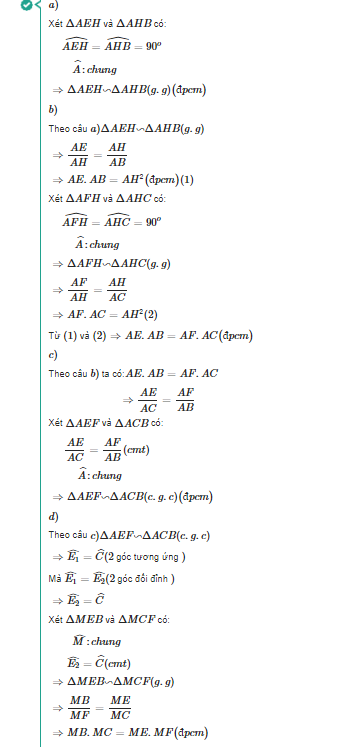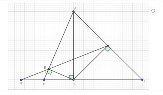 \triangle AHE \sim \triangle AMB \quad và \quad \triangle AHF \sim \triangle AMC.