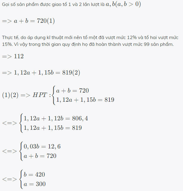 Giả sử số sản phẩm kế hoạch của tổ 1 và tổ 2 là \( x \) và \( y \):