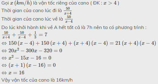 B, nghỉ 20 phút ở bến B rồi quay lại bến A. Kể từ lúc khởi hành đến khi về tới bến A hết tất cả là 7 giờ. Hãy tìm vận tốc riêng của ca nô, biết vận tốc của dòng nước là 4km/h.