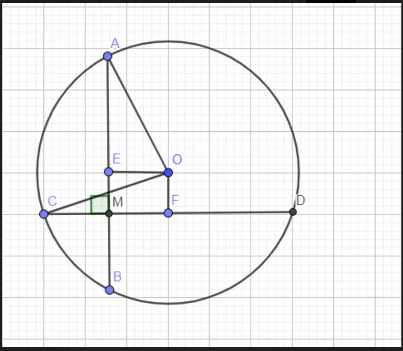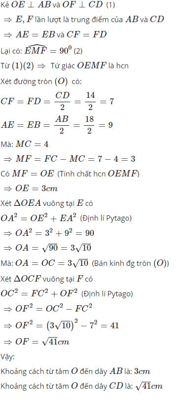 cho đường tròn tâm O , hai dây AB và CD vuông góc với nhau ở M . biết AB=18cm , CD=14cm , MC=4cm . hãy tính khoảng cách từ tâm O đến mỗi dây AB và CD . vẽ hình trước khi làm