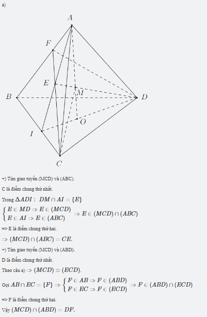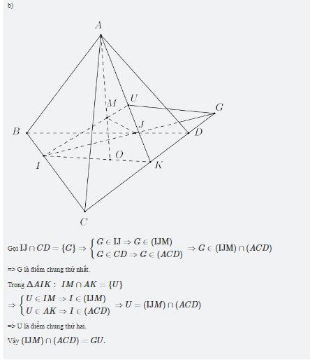 Cho tứ diện ABCD, O là một điểm thuộc miền trong tam giác BCD, M là điểm trên đoạn AO. a, tìm giao tuyến của mặt phẳng (MCD) với các mặt phẳng (ABC), (ABD). b, Gọi I,J là các điểm tương ứng trên các cạnh BC và BD sao cho IJ không song song với CD. Tìm giao tuyến của w mặt phẳng (IJM) và (ACD)