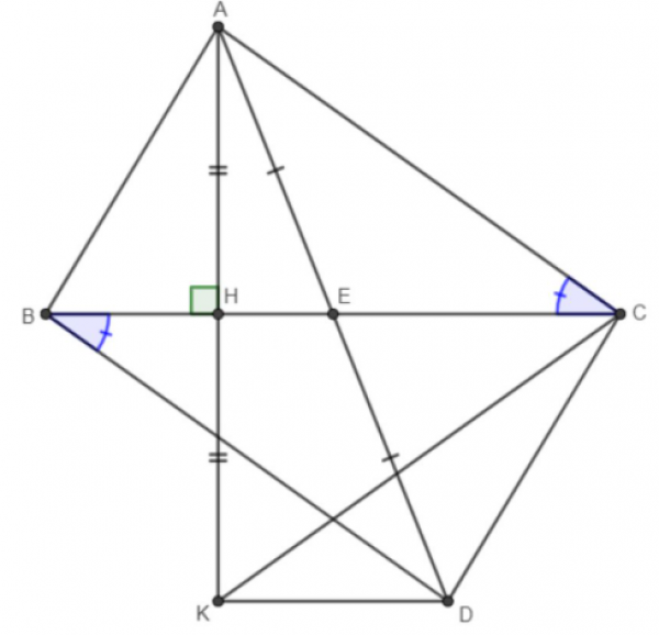 Cho tam giác ABC nhọn có AB<AC. lấy E là trung điểm của BC. Trên tia AE lấy điểm D sao cho E là trung điểm của AD. a, Chứng minh tam giác ABE = tam giác DCE. b, Chứng minh AC song song BD. c, Vẽ AH vuông góc BC. Trên tia AH lấy điểm K sao cho H là trung điểm của AK. Chứng minh BD = AC = CK. d, Chứng minh DK vuông góc AH