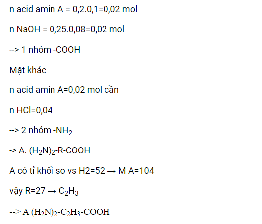 Cho 100ml dung dịch amino acid X 0,2M tác dụng vừa đủ 80ml dung dịch naoh 0,25M. Mặt khác 100ml dung dịch amino acid X 0,2M trên tác dụng vừa đủ 80ml dung dịch hcl 0,5M thu được 3,54 gam muối .công thức của X là ?
