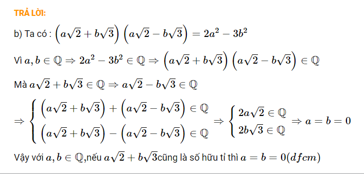 Chúng ta đã chứng minh rằng nếu \( a + b\sqrt{2} \in \mathbb{Q} \), thì \( b = 0 \).