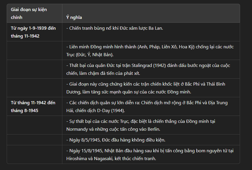 Dưới đây là bảng tóm tắt những sự kiện chính của Chiến tranh thế giới thứ hai (1939-1945):