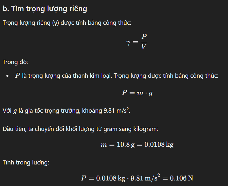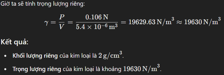 Để giải bài toán này, chúng ta sẽ sử dụng các công thức về khối lượng riêng và trọng lượng riêng.