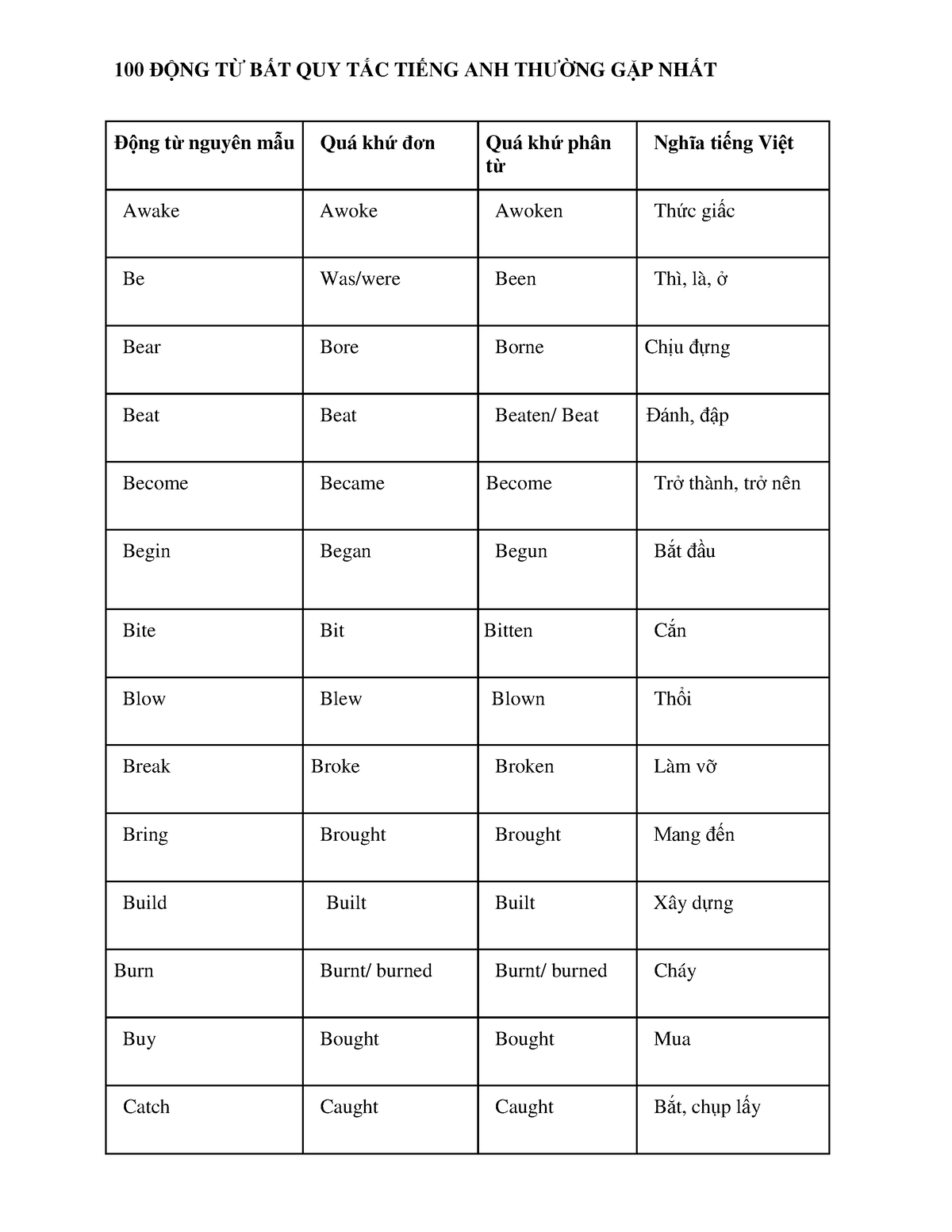 Dưới đây là bảng động từ bất quy tắc trong tiếng Anh: