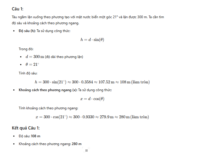 Câu1:Tàu ngầm đang ở trên mặt biển bỗng đột ngột lặn xuống theo phương tạo với mặt nước biển một góc 21°. Nếu tàu chuyển động theo phương lặn xuống được 300 m thì nó ở độ sâu bao nhiêu? Khi đó khoảng cách theo phương ngang so với nơi xuất phát là bao nhiêu mét?( kết quả làm tròn đến mét).