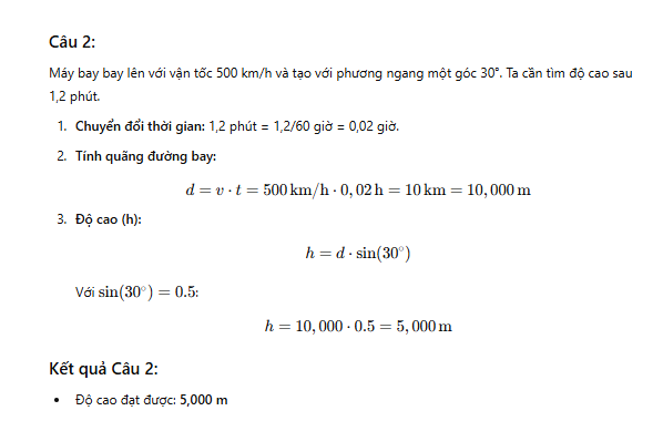 Câu 2: một chiếc máy bay, đang bay lên với vận tốc 500 km/h. Đường bay lên tạo với phương ngang một góc 30°. Hỏi sau một 1,2 phút kể từ lúc cất cánh, máy bay đạt được độ cao là bao nhiêu?