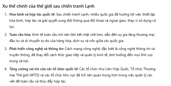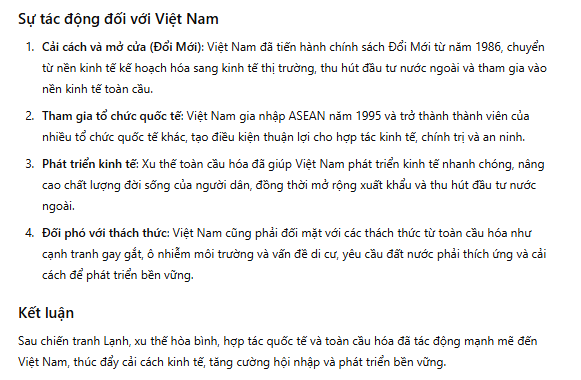 Xu thế chính của thế giới sau chiến tranh Lạnh đã mở ra nhiều cơ hội và thách thức cho Việt Nam. Sự chuyển mình trong chính sách đối ngoại và kinh tế đã giúp Việt Nam hội nhập sâu rộng hơn với thế giới, nhưng cũng cần phải đối mặt với những thách thức về môi trường và phát triển bền vững.