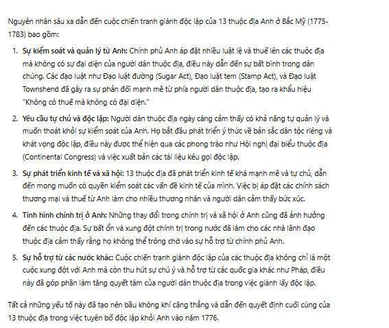 Chiến tranh giành độc lập của 13 thuộc địa Anh ở Bắc Mỹ (1775-1783) diễn ra không chỉ do những nguyên nhân ngay trước mắt mà còn do nhiều yếu tố sâu xa. Dưới đây là một số nguyên nhân chính: