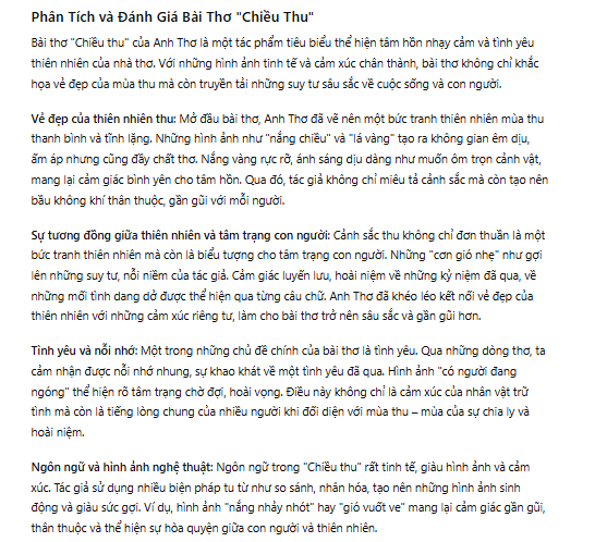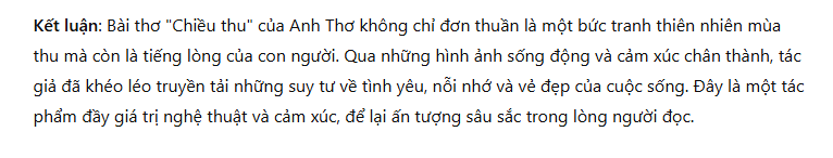 "Chiều thu" của Anh Thơ là một bài thơ giàu chất trữ tình, thể hiện vẻ đẹp của thiên nhiên và những suy tư sâu sắc của con người. Tác phẩm không chỉ giúp người đọc cảm nhận được cái đẹp của mùa thu mà còn gợi mở những vấn đề triết lý về cuộc sống và thời gian. Chính vì vậy, bài thơ vẫn mãi để lại ấn tượng sâu sắc trong lòng người đọc, là minh chứng cho tài năng và tâm hồn nhạy cảm của nhà thơ Anh Thơ.
