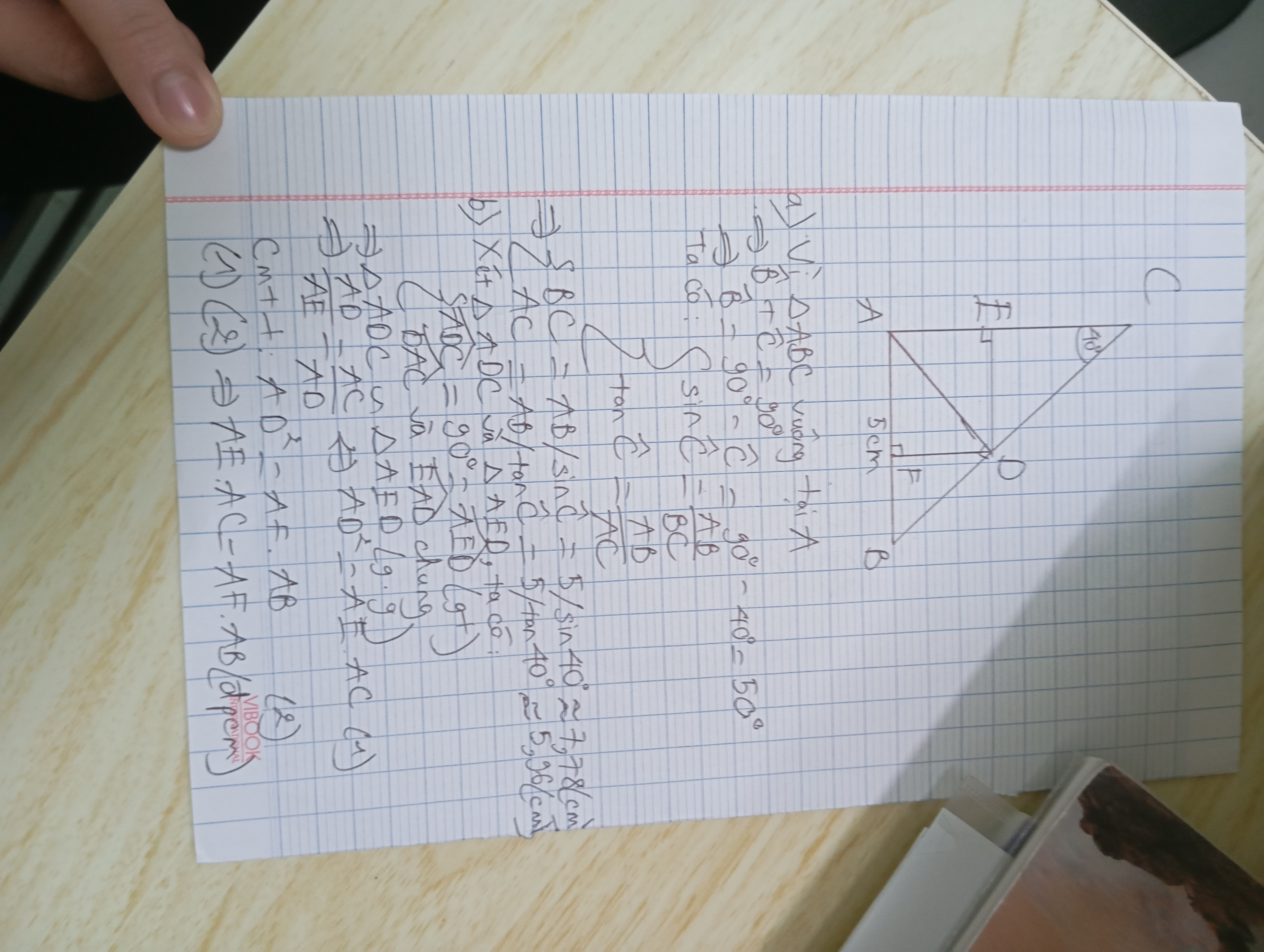 Bài 33: Cho ΔABC vuông tại A có AB = 5 cm, C = 40°. a) Giải ΔABC. (Hình 10) b) Vẽ đường cao AD, từ D kẻ DE ⊥ AC, DF ⊥ AB. Chứng minh AF · AB = AE · AC.