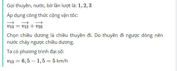 => Vận tốc của thuyền với bờ sông : v1,3 = v1,2 + v2,3 = 15 + 1 = 16 (km/h)