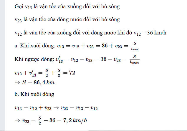 Câu 2: một xuồng máy đi trong nước yên lặng với v = 36 km trên giờ. Khí xuôi dòng từ a đến b mất 2 giờ, ngược dòng từ b đến a mất 3 giờ. Vận tốc của dòng nước so với bờ sông.