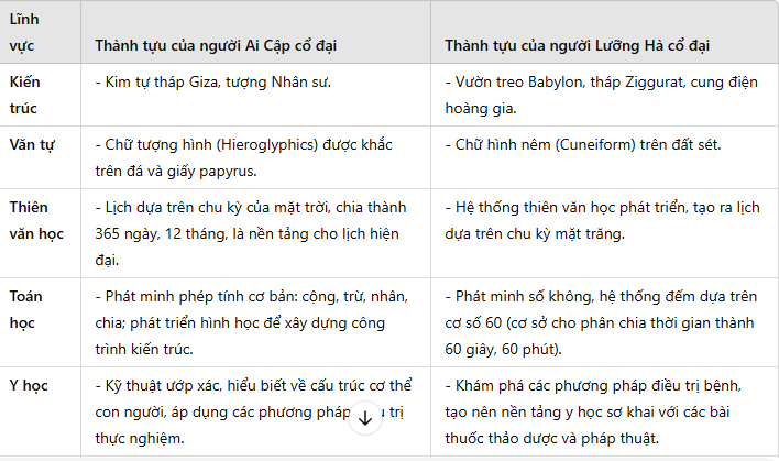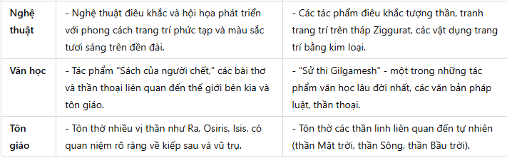 | Khoa học và Công nghệ| - Đo đạc và tính toán (xây dựng kim tự tháp, lập lịch âm dương) | - Hệ thống chữ viết (chữ hình nêm - cuneiform) |